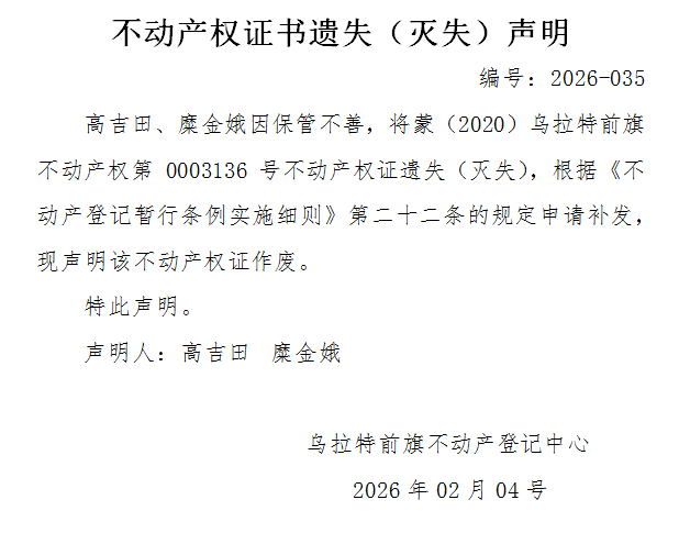 高吉田 糜金娥不动产权证书遗失(灭失)声明