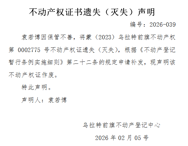 袁若博不动产权证书遗失(灭失)声明