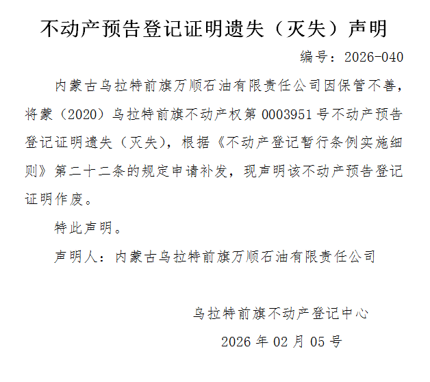 内蒙古乌拉特前旗万顺石油有限责任公司不动产预告登记证明(蒙(2020)乌拉特前旗不动产权第0003951号)遗失(灭失)声明