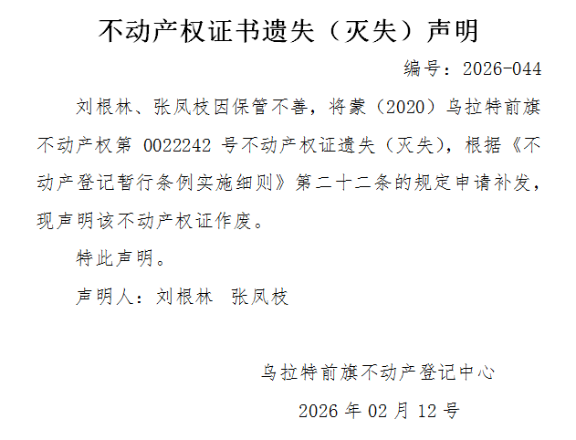 刘根林 张凤枝不动产权证书遗失(灭失)声明
