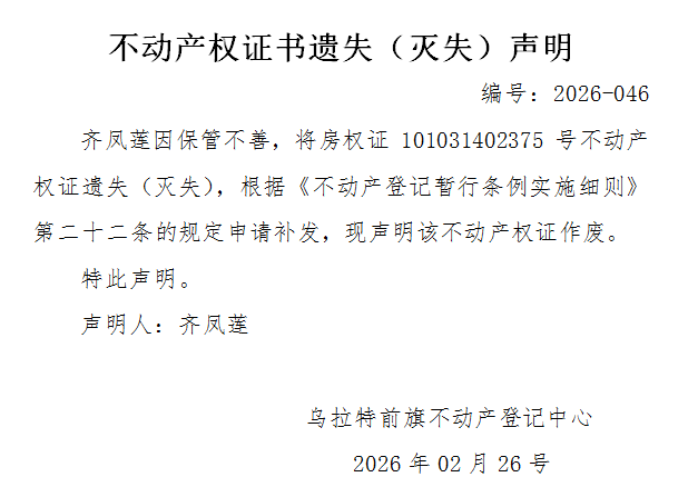齐凤莲不动产权证书遗失(灭失)声明
