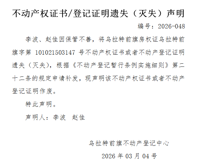 李波、赵佳不动产权证书遗失(灭失)声明