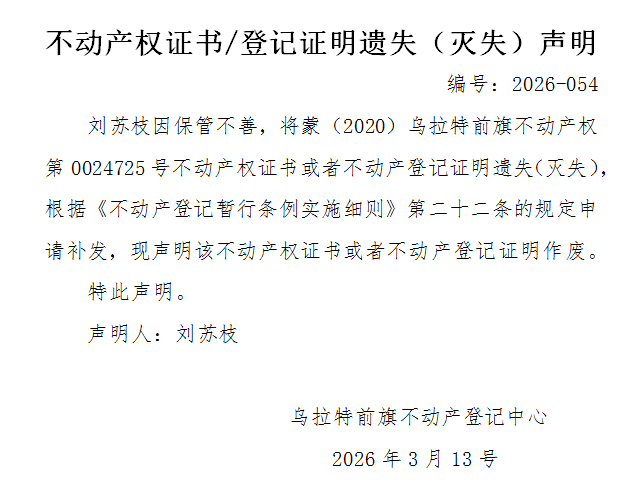 刘苏枝不动产权证书(蒙(2020)乌拉特前旗不动产权第0024725号)遗失(灭失)声明