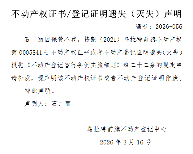 石二丽不动产权证书(蒙(2021)乌拉特前旗不动产权第0005841号)遗失(灭失)声明