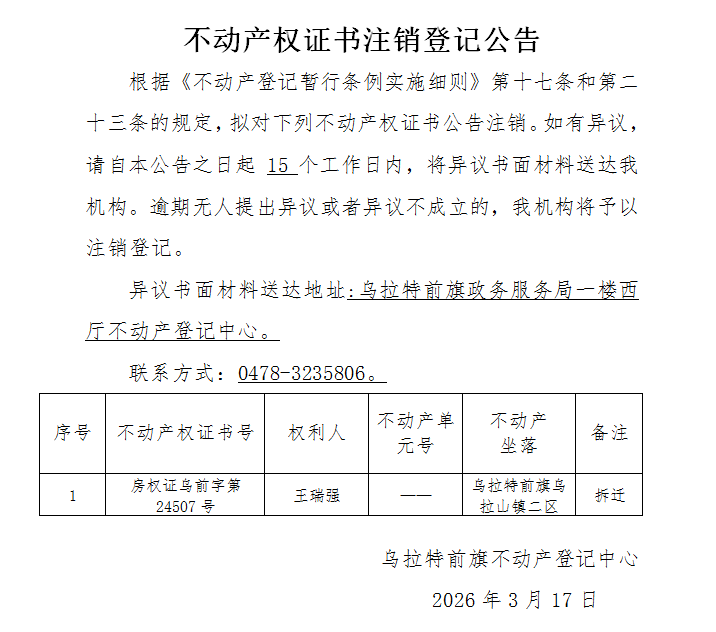 王瑞强不动产权证书注销登记公告