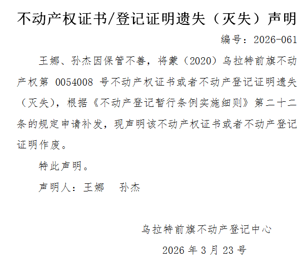 王娜、孙杰不动产权证书(蒙(2020)乌拉特前旗不动产权第0054008号)遗失(灭失)声明