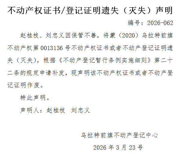 赵桂枝、刘忠义不动产权证书(蒙(2020)乌拉特前旗不动产权第0013136号)遗失(灭失)声明