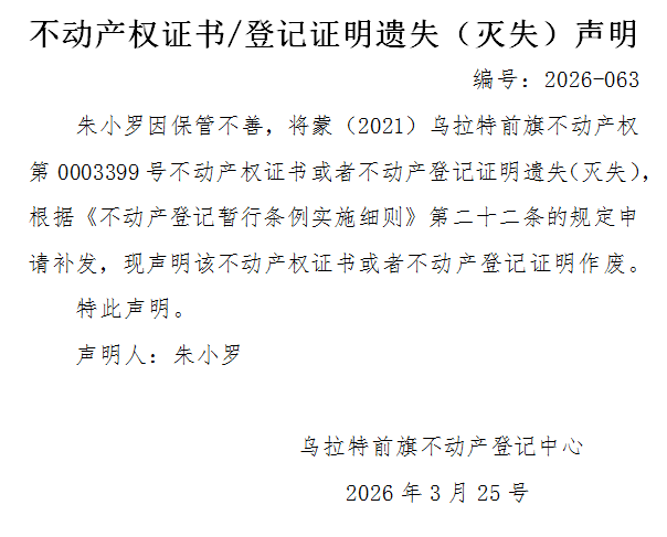 朱小罗不动产权证书(蒙(2021)乌拉特前旗不动产权第0003399号)遗失(灭失)声明