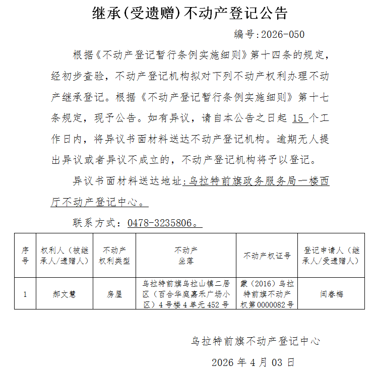 来源:乌拉特前旗不动产登记中心