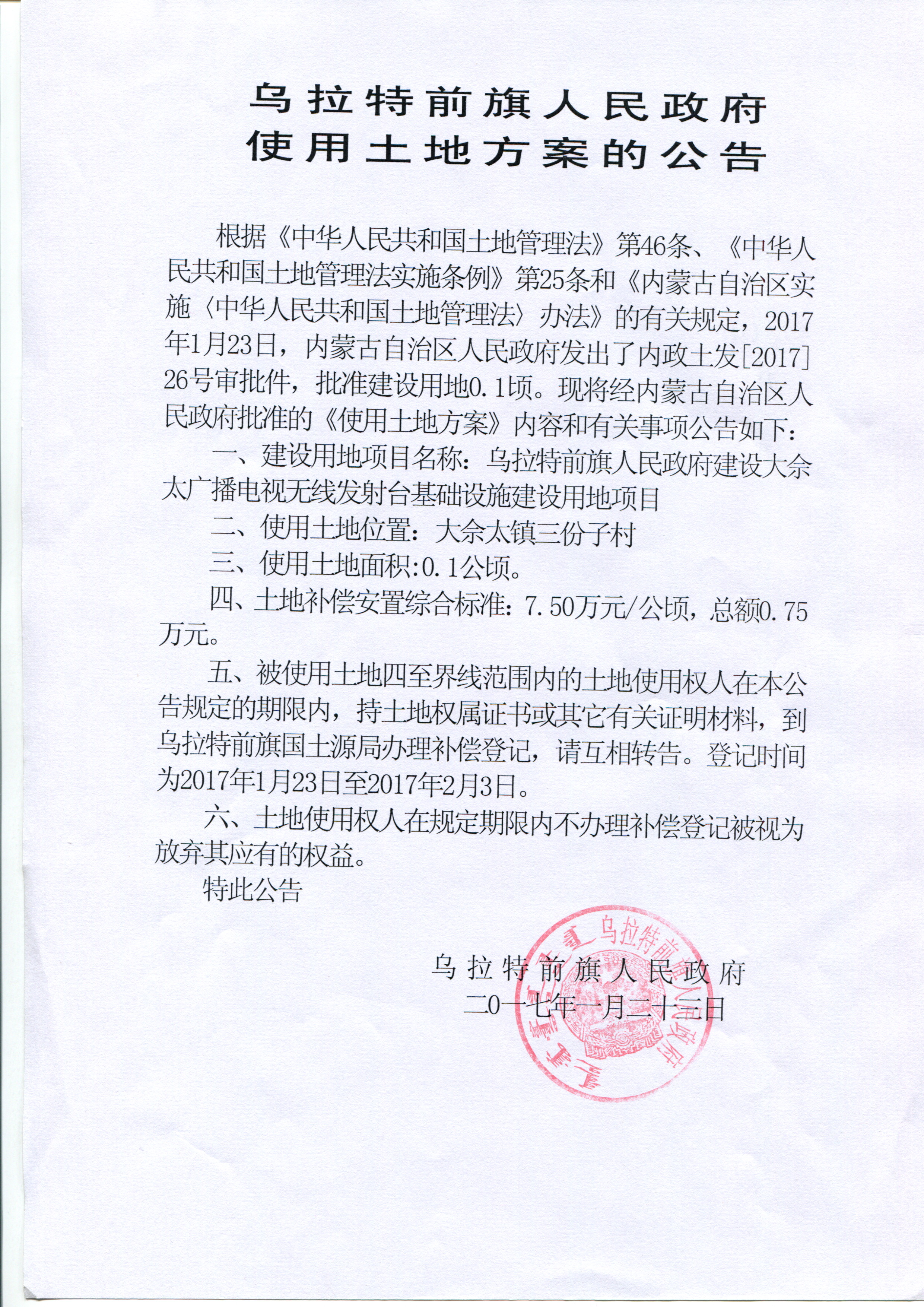 乌拉特前旗人民政府使用土地公告-大佘太三份子村