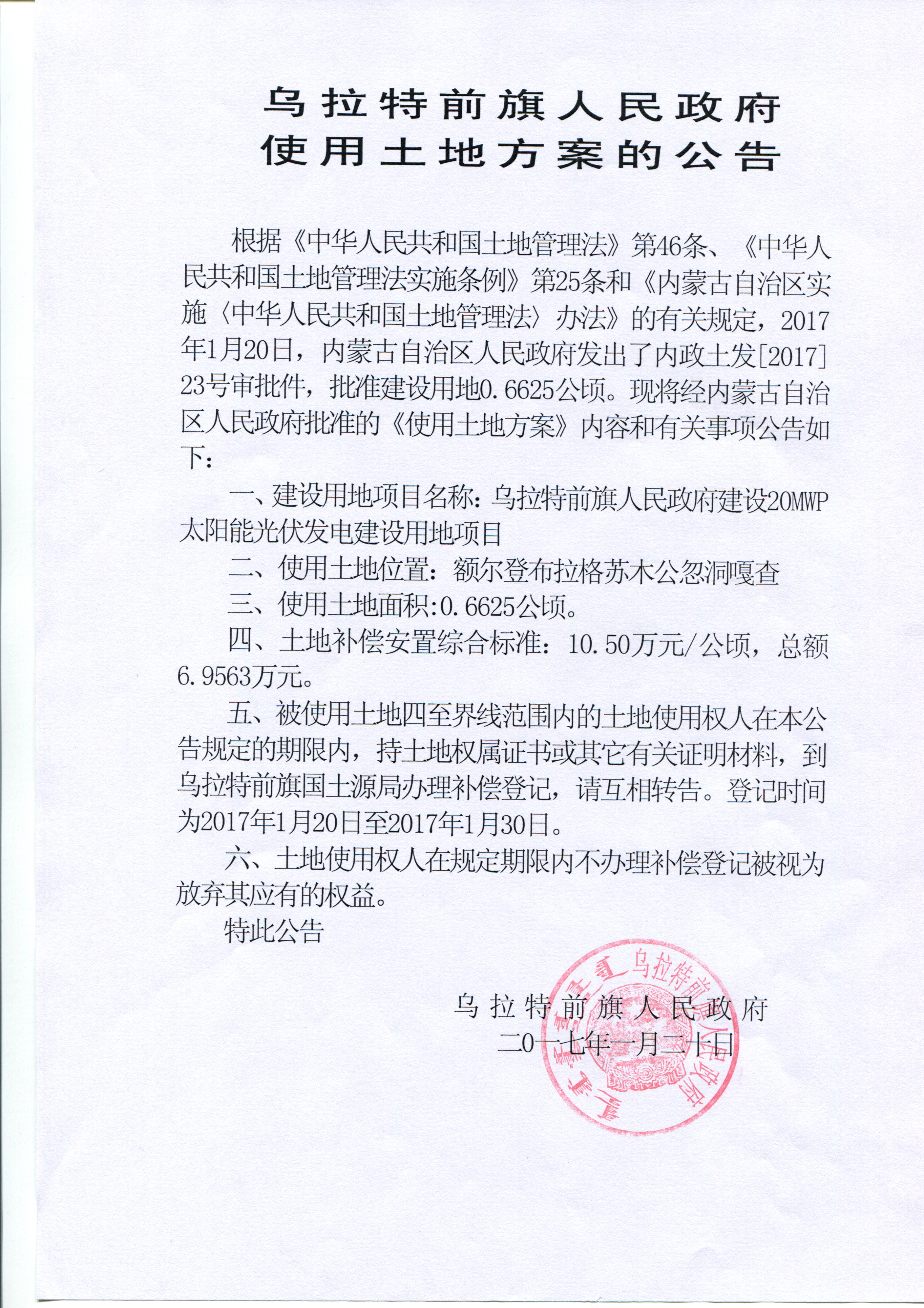 乌拉特前旗人民政府使用土地方案公告-额尔登布拉格苏木公忽洞嘎查