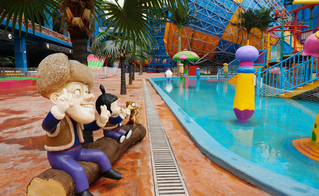 水世界占地面积为10万平米,其中室内区域建筑面积为2.5万平米,总投资8500余万元建成。水世界娱乐区的外部是大鲸鱼造型,增添了感官上的趣味性和广告效果;除四周配备了自然通风、透光窗户外,顶部选用了阳光锁扣板这种新型材料,不仅增加了建筑物的稳定和保温性,而且透光性能极强,有机的把水、阳光、植物、沙滩等北方人向往的景象浓缩溶为一体,而且四季开放,为游客提供了一个舒适、伊人、闲逸、回味无穷的环境。