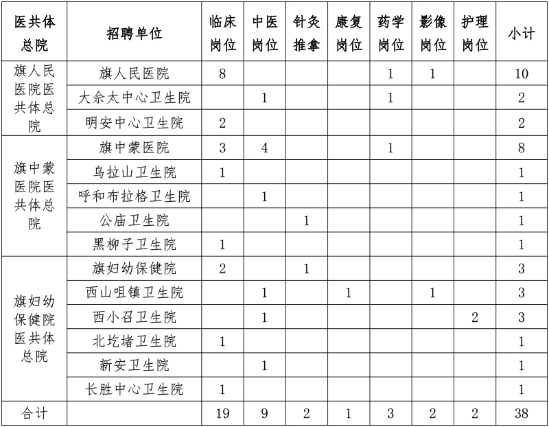 2024年计划为乌拉特前旗三所总医院校园招聘专业技术人员38名(旗人民医院医共体总医院14人,旗中蒙医院医共体总医院12人,旗妇幼保健院医共体总医院12人),具体单位及名额见下表: