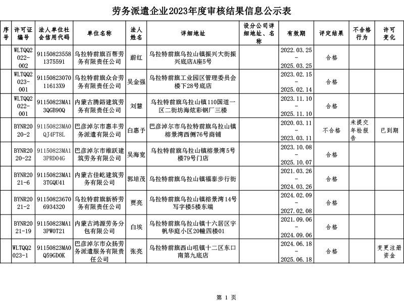 乌拉特前旗劳务派遣企业2023年度审核结果信息公示表
