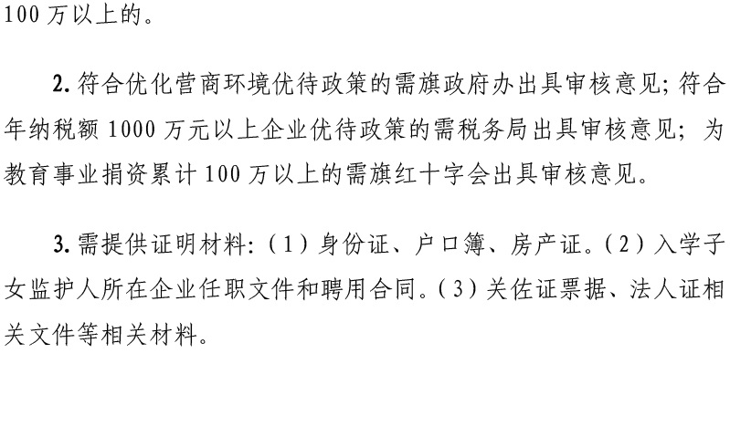 3.优化营商环境引进高层次人才子女及为教育事业捐资助学的企业、个人子女(后附优待政策审核表)。