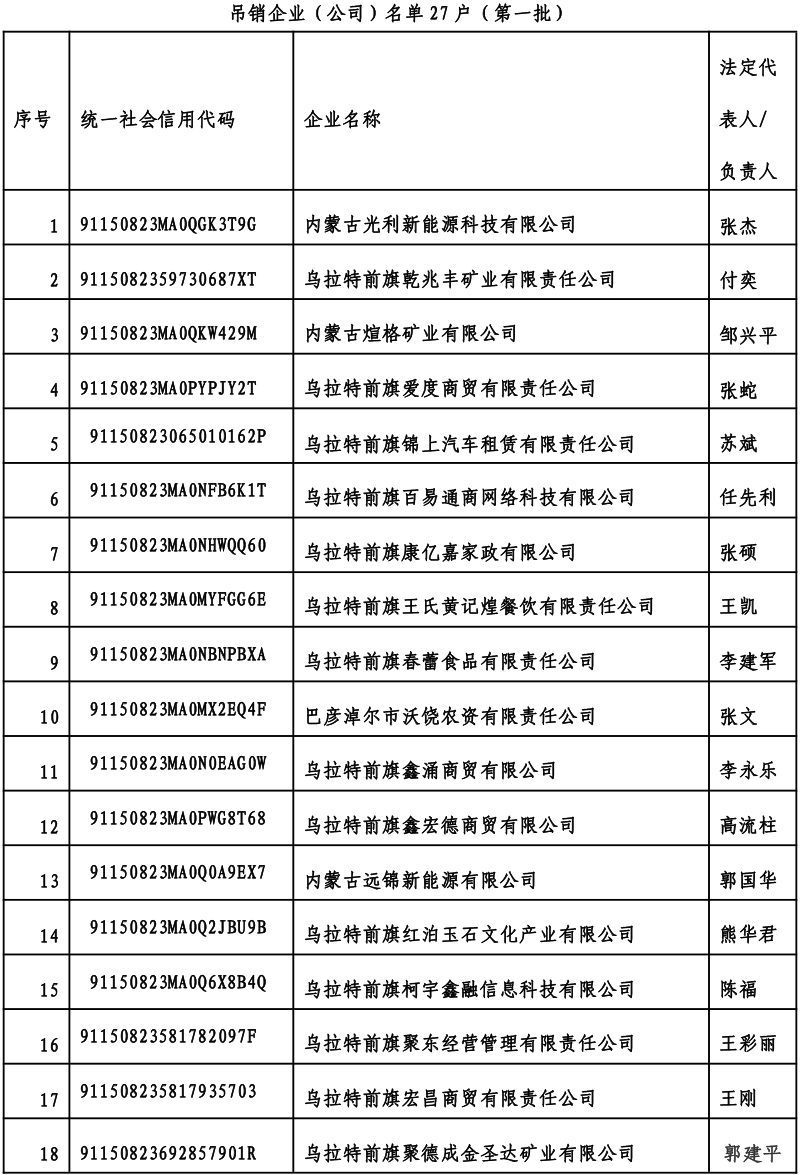 内蒙古光利新能源科技有限公司等27户企业(后附:吊销企业(公司)名单第一批)未按《企业信息公示暂行条例》第八条有关规定按时公示2021、2022年度报告,已被乌拉特前旗市场监督管理局依法列入经营异常名录,当事人也未向登记机关申请注销登记。我局执法人员依法对当事人登记住所(经营场所)进行现场检查、拍照取证和询问通知书挂号信邮寄,未发现当事人在登记住所(经营场所)有经营行为。