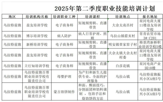 乌拉特前旗就业服务中心第二季度技能培训计划