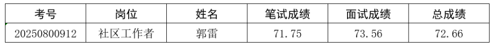 按照《2025年乌拉特前旗补充招聘社区工作者公告》要求和有关规定,部分考生主动放弃体检考察资格,现根据总成绩排名由高到低递补1人进入体检考察范围,递补人员名单如下: