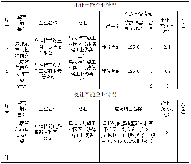 乌拉特前旗三才第八铁合金有限公司和乌拉特前旗大为工贸有限责任公司2户企业产能出让公告