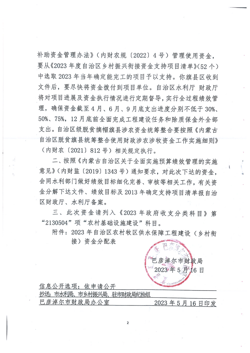 现将财政分配到水利局的2023年自治区农村牧区供水保障工程建设(乡村振兴衔接)资金465万元,通过旗政府网站进行公告,欢迎社会各界监督。