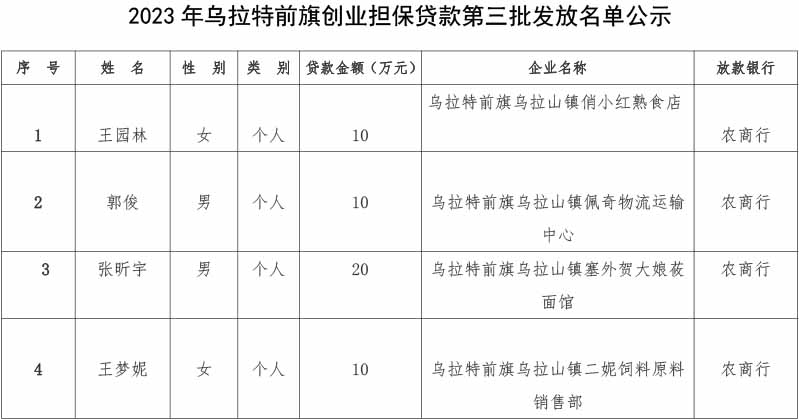关于乌拉特前旗创业担保贷款第三批发放名单的公示