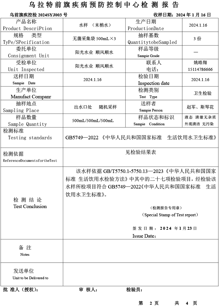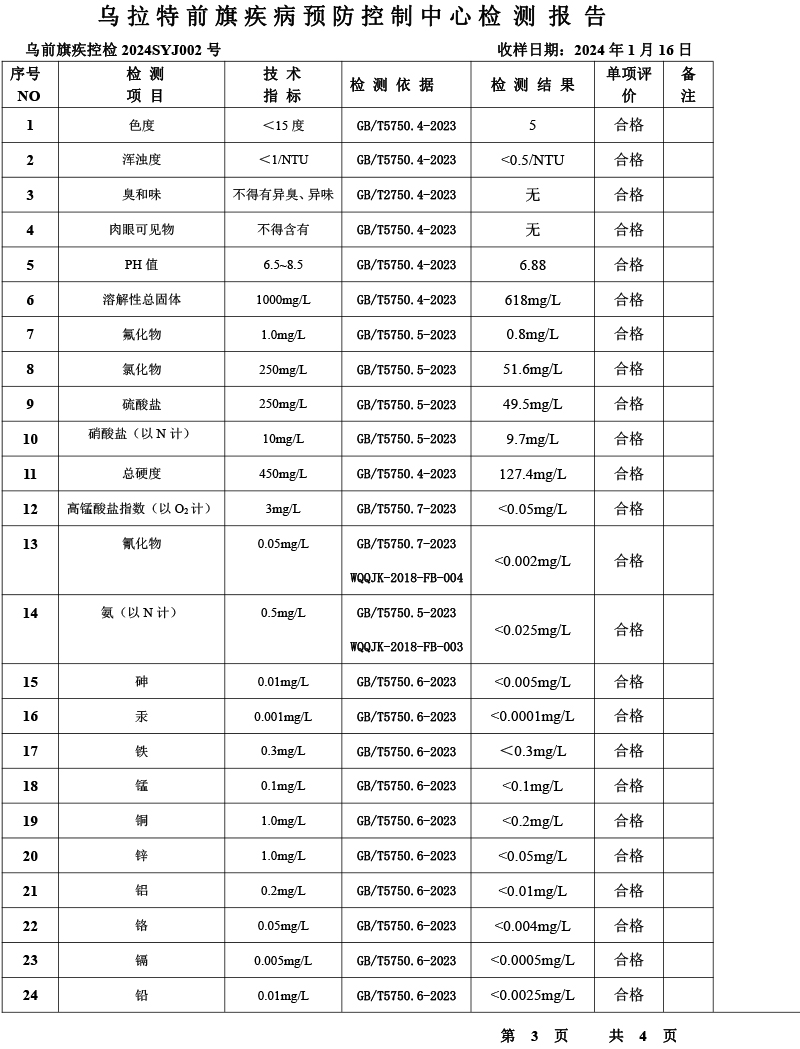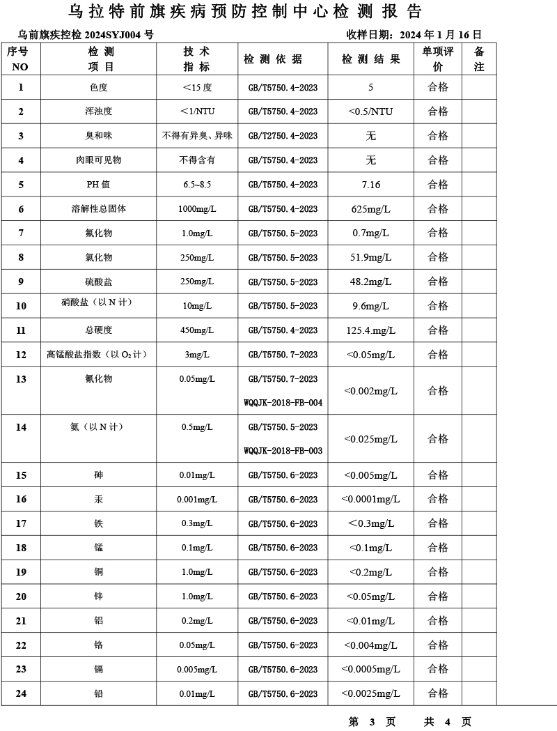 乌拉特前旗乌拉山镇集中式生活饮用水水质报告(2024年1月)