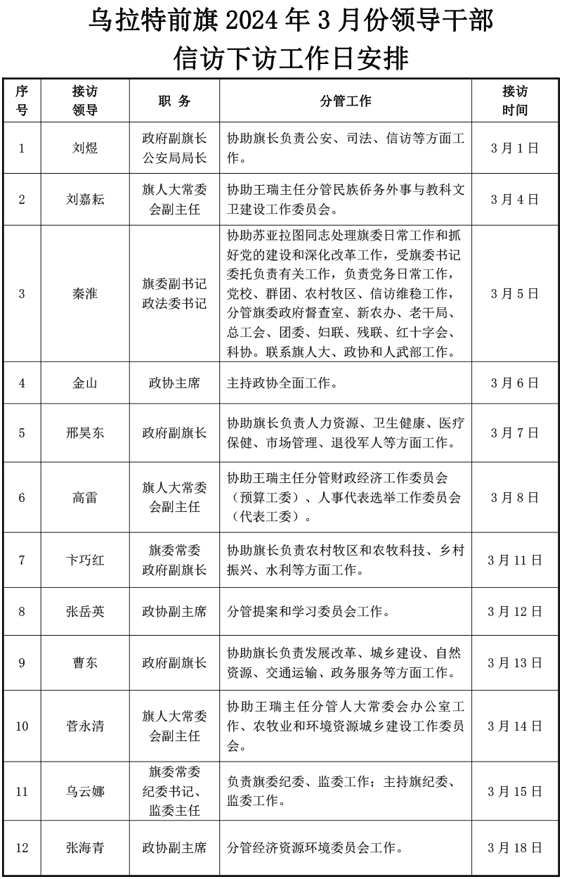 乌拉特前旗2024年3月份领导干部信访下访工作日安排
