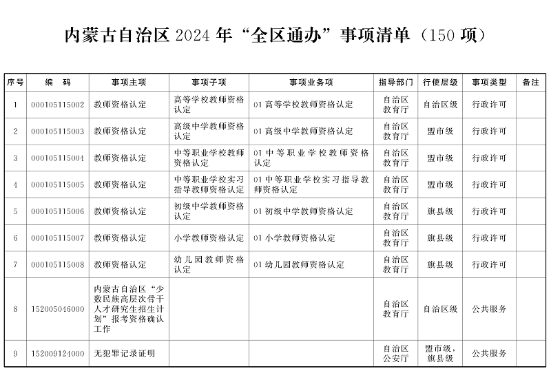 内蒙古自治区人民政府办公厅关于印发 自治区2024年“全区通办”事项清单的通知