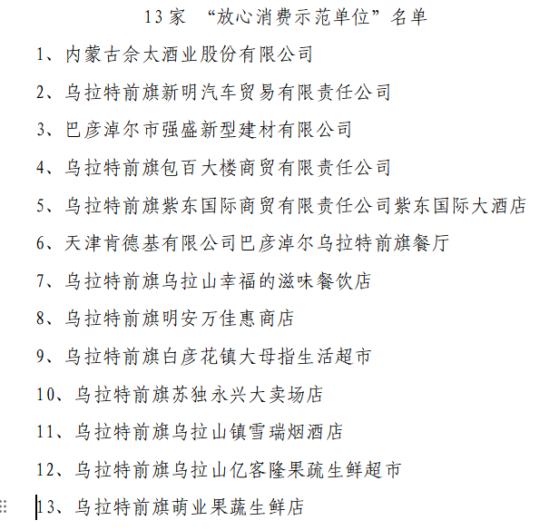乌拉特前旗市场监督管理局为13家“放心消费示范单位”授牌