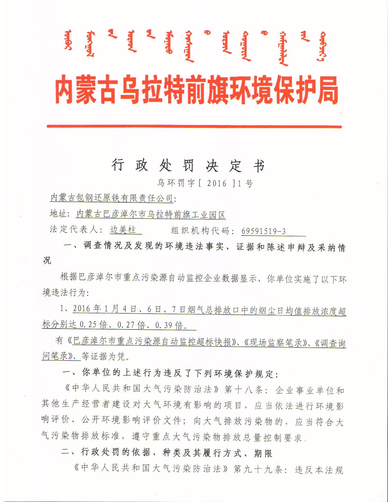 行政处罚决定书-包钢还原铁有限责任公司