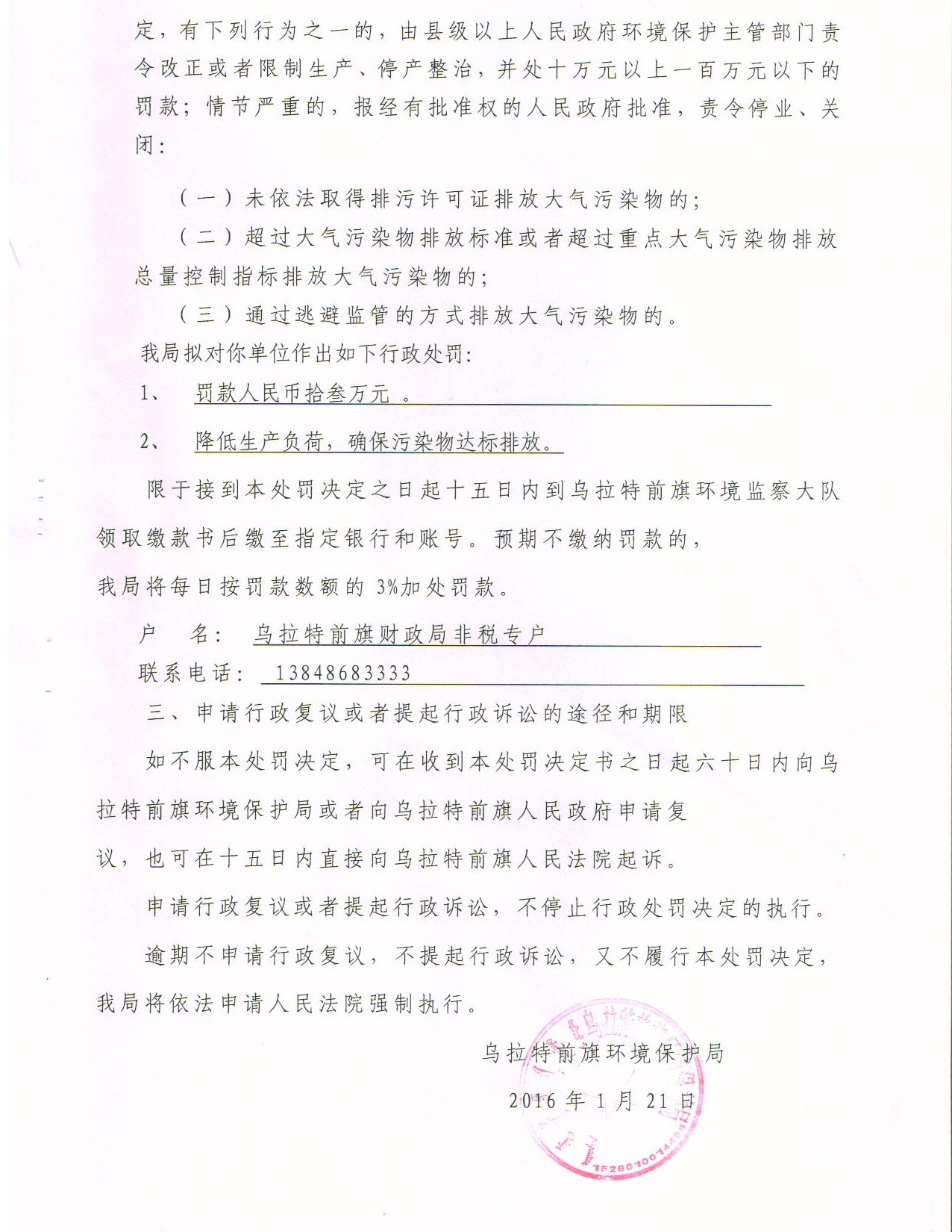乌拉特前旗环保局关于2016年6月6日建设项目环境影响评价文件受理情况的公示