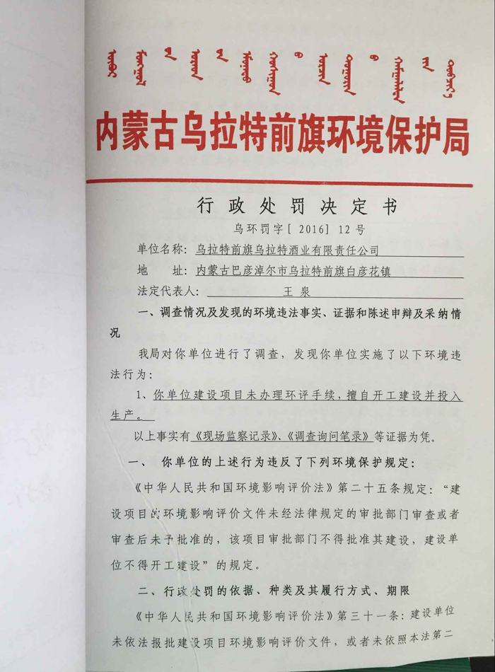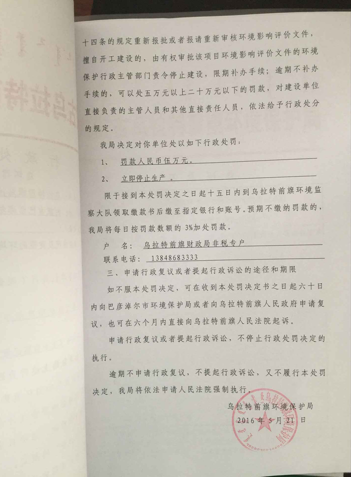 乌拉特前旗环保局2016年8月15日作出的建设项目环境影响评价文件审批决定的公告