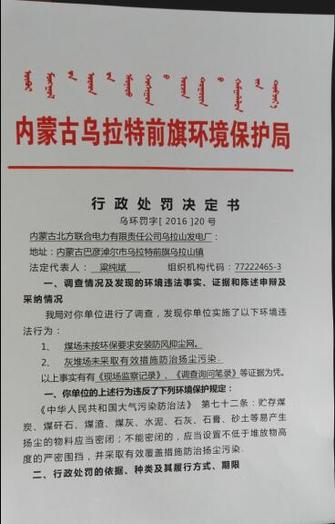 行政处罚决定书—内蒙古北方联合电力有限责任公司乌拉山发电厂