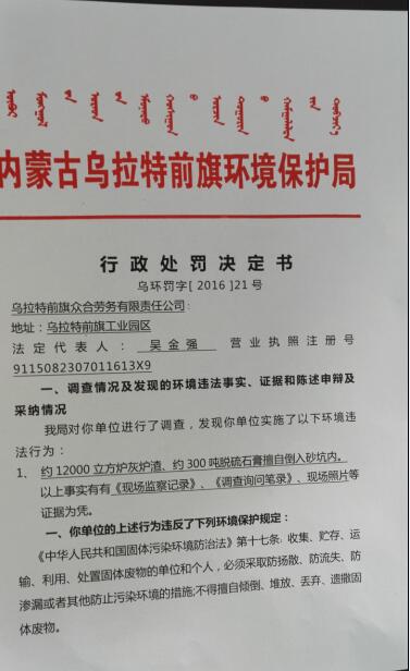 行政处罚决定书—乌拉特前旗众合劳务有限责任公司