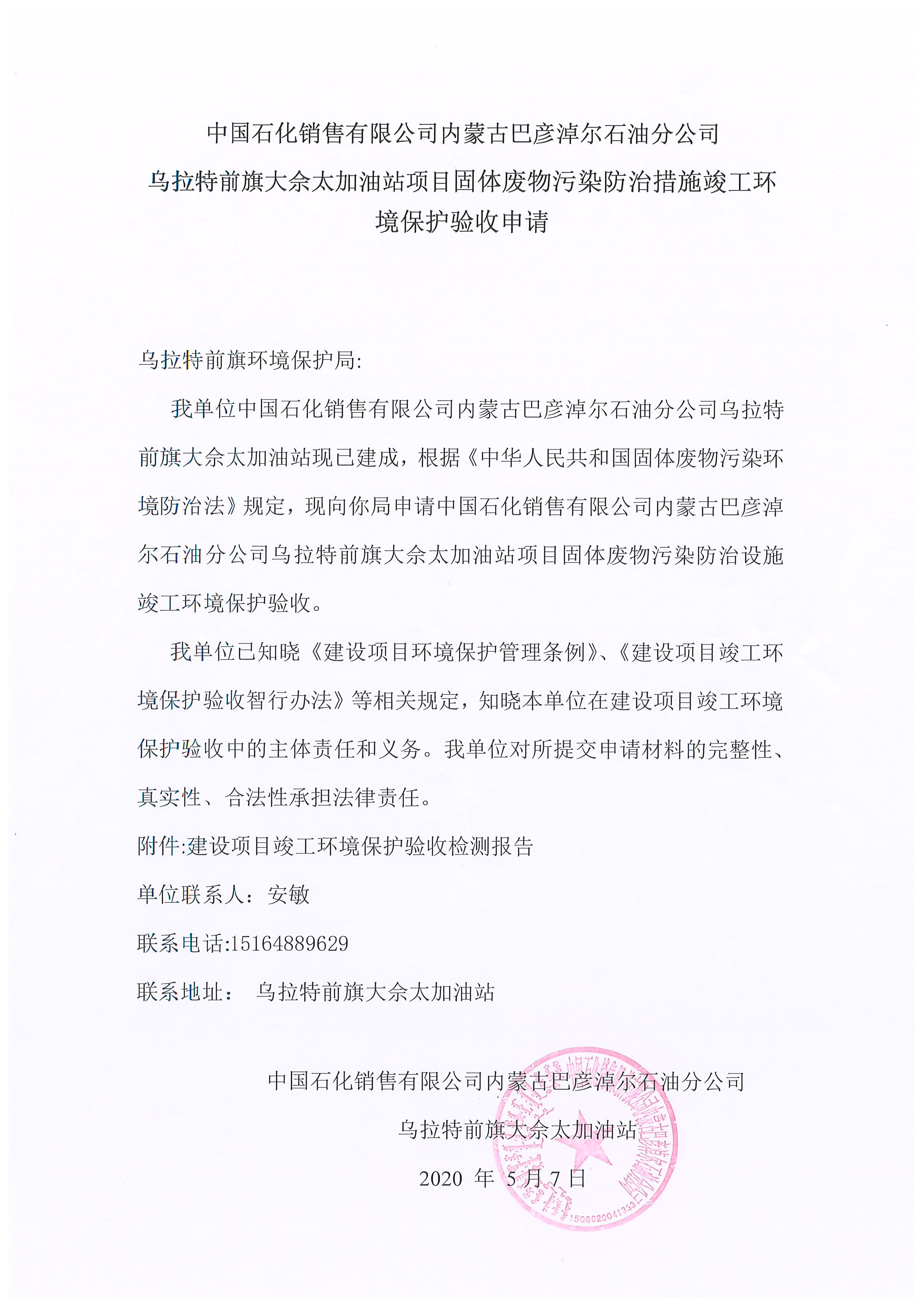 根据建设项目竣工环境保护验收管理有关规定,我局受理了中国石化销售有限公司内蒙古巴彦淖尔石油分公司乌拉特前旗政府北街加油站、乌拉特前旗二号加油站、乌拉特前旗大佘太加油站3个项目环境保护验收申请文件。现将受理情况予以公示,公示期为2020年5月9日—2020年5月19日(10个工作日)。
