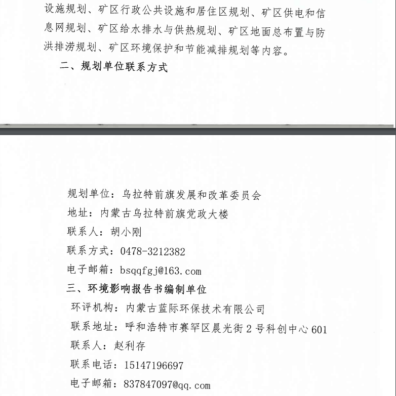 内蒙古自治区乌拉山煤田营盘湾矿区总体规划环境影响评价第一次公示