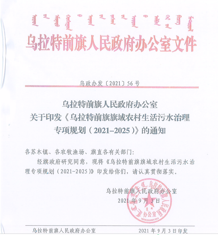 乌拉特前旗人民政府办公室关于印发《乌拉特前旗旗域农村生活污水治理专项规划(2021-2025)》的通知