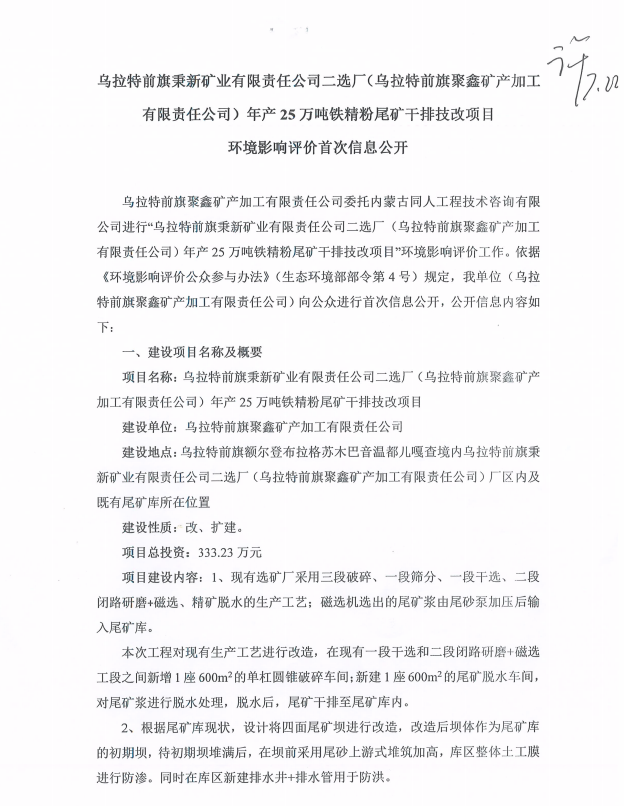 乌拉特前旗秉新矿业有限责任公司二选厂(乌拉特前旗聚鑫矿产加工有限责任公司)年产25万吨铁精粉尾矿干排技改项目环境影响评价首次信息公开