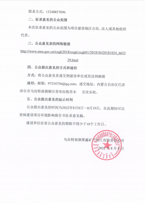 乌拉特前旗秉新矿业有限责任公司二选厂(乌拉特前旗聚鑫矿产加工有限责任公司)年产25万吨铁精粉尾矿干排技改项目环境影响报告书征求意见稿形成后征求意见的公开信息