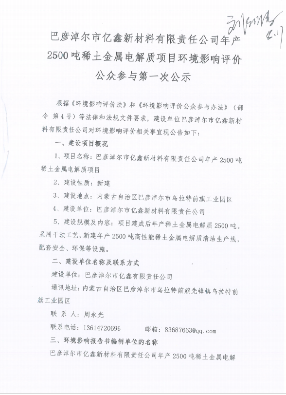 巴彦淖尔市亿鑫新材料有限责任公司年产2500吨稀土金属电解质项目环境影响评价公众参与第一次公示