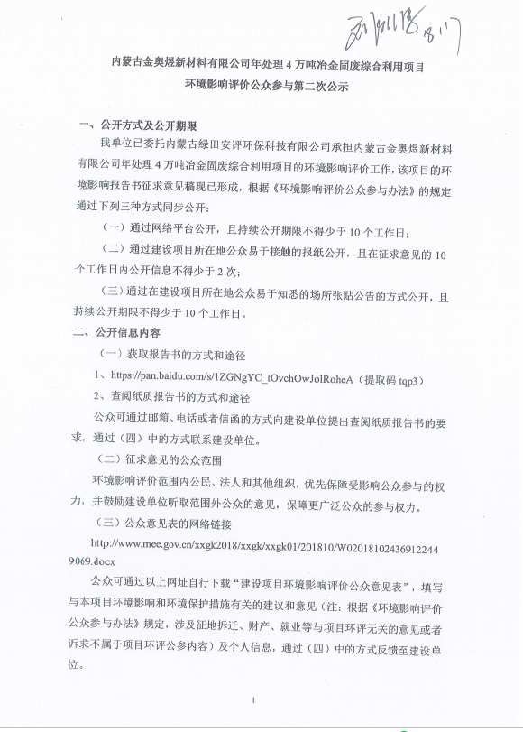 内蒙古金奥煜新材料有限公司年处理4万吨冶金固废综合利用项目环境影响评价公众参与第二次公示