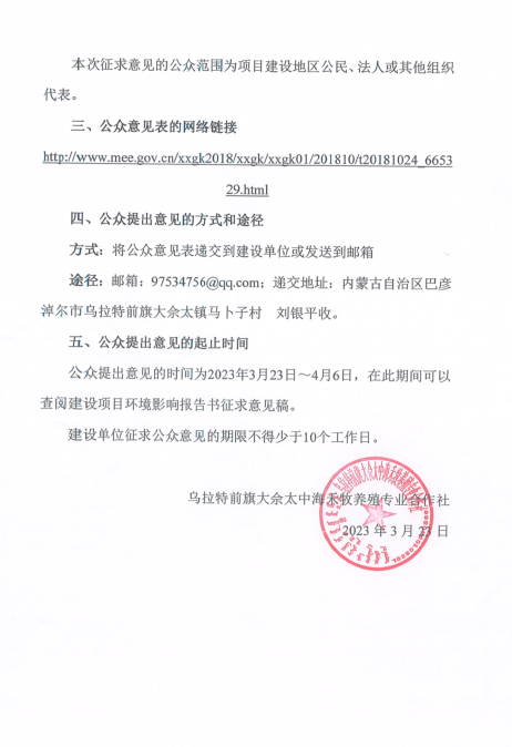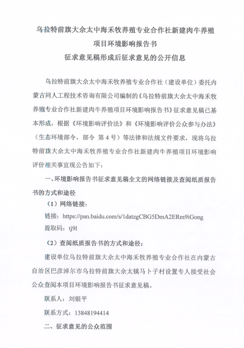 乌拉特前旗大佘太中海禾牧养殖专业合作社新建肉牛养殖项目环境影响报告书征求意见稿形成后征求意见的公开信息