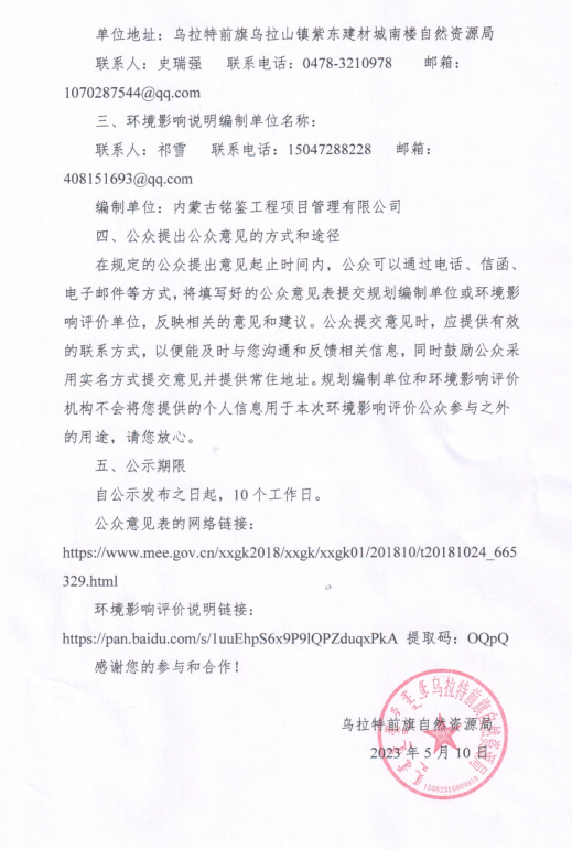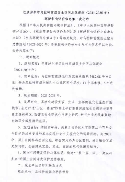 巴彦淖尔市乌拉特前旗国土空间总体规划(2021-2035年)环境影响评价信息第一次公示