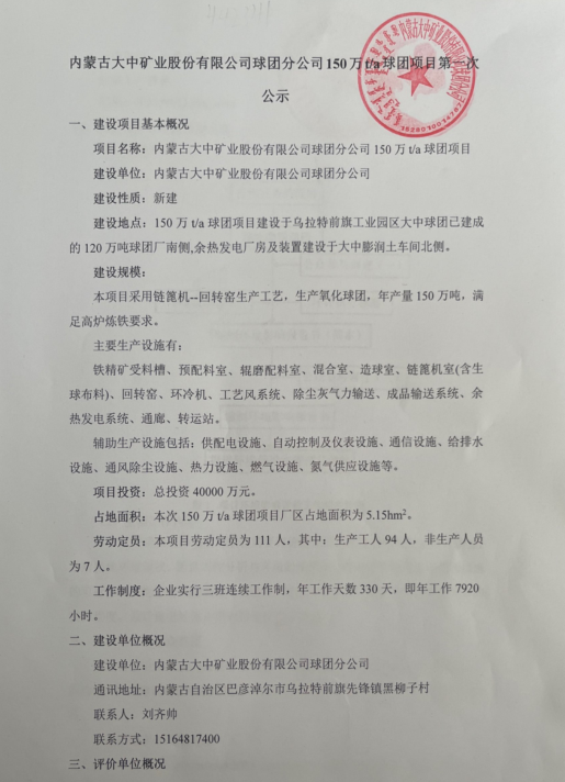 内蒙古大中矿业股份有限公司球团分公司150万t/a球团项目第一次公示