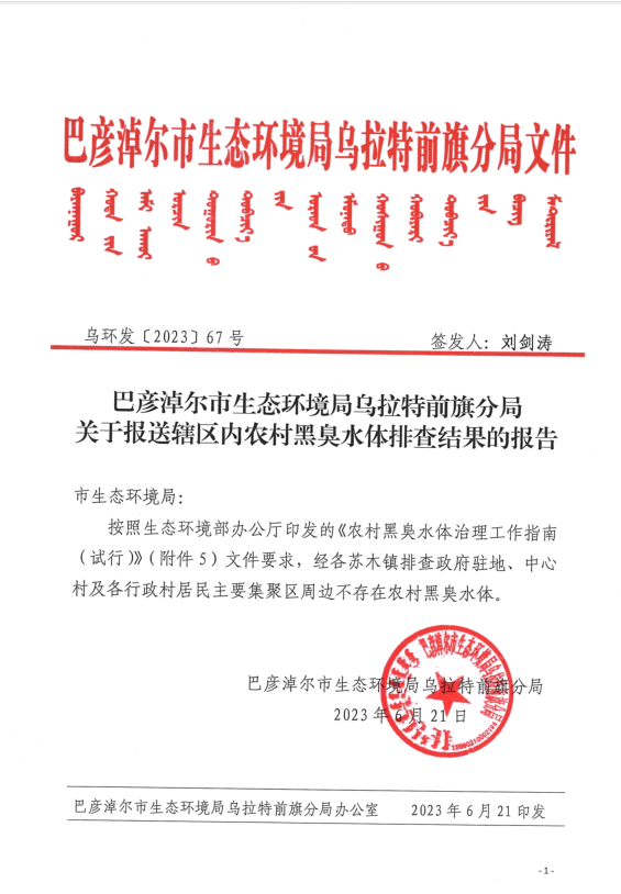 巴彦淖尔市生态环境局乌拉特前旗分局关于报送辖区内农村黑臭水体排查结果的报告