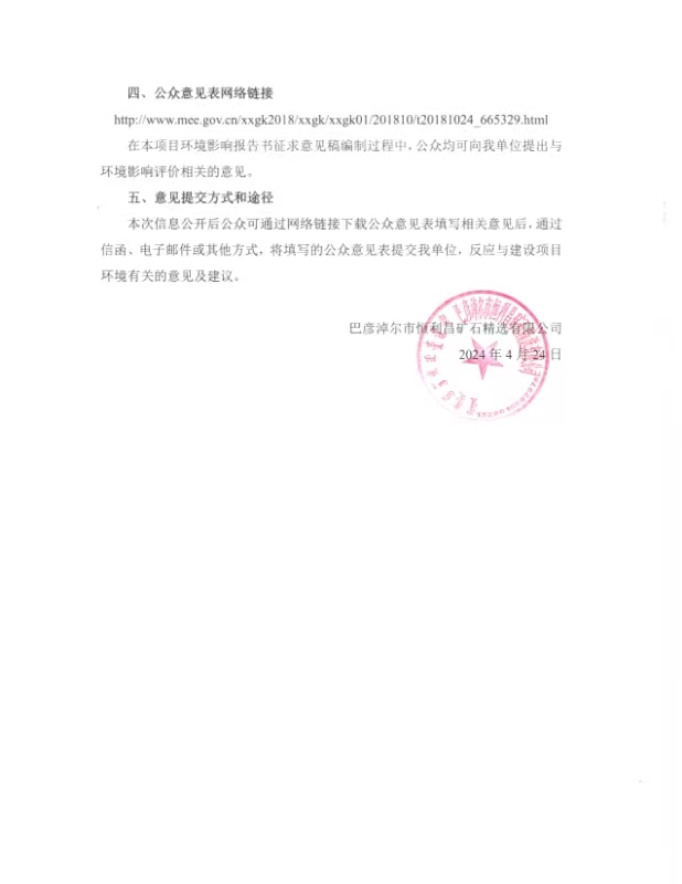 巴彦淖尔市恒利昌矿石精选有限公司年产35万吨高纯铁精粉技术改造项目环境影响评价首次信息公开
