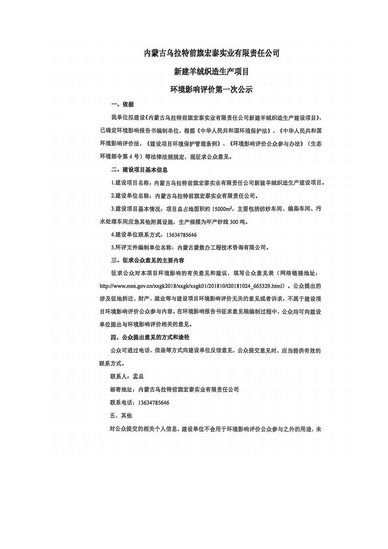 内蒙古乌拉特前旗宏泰实业有限责任公司新建羊绒织造生产建设项目环境影响评价第一次公示
