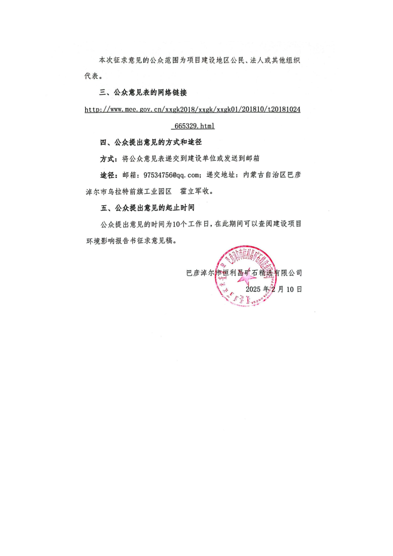 巴彦淖尔市恒利昌矿石精选有限公司年产35万吨高纯铁精粉改造项目环境影响报告书征求意见稿形成后征求意见的公开信息