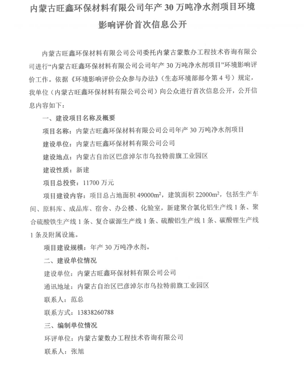 第一次公示--内蒙古旺鑫环保材料有限公司年产30万吨净水剂项目