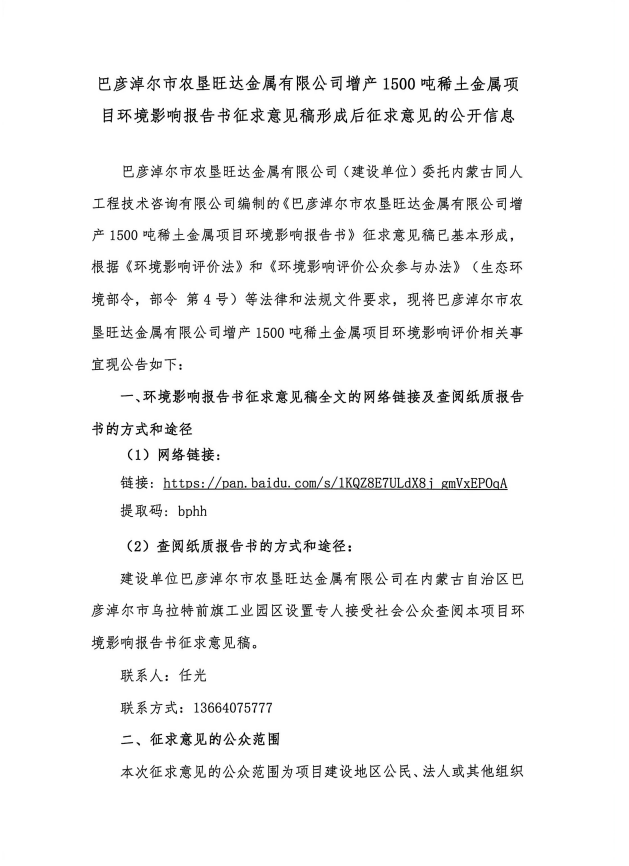 巴彦淖尔市农垦旺达金属有限公司增产1500吨稀土金属项目环境影响报告书征求意见稿形成后征求意见的公开信息